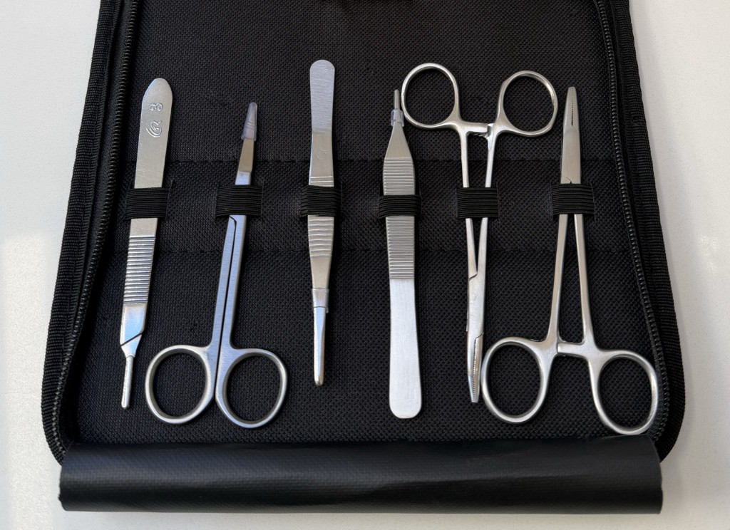 5 nylon 4-0 monofilament sutures and 5 scalpel blades. Supplied in a compact zip-up carry case.