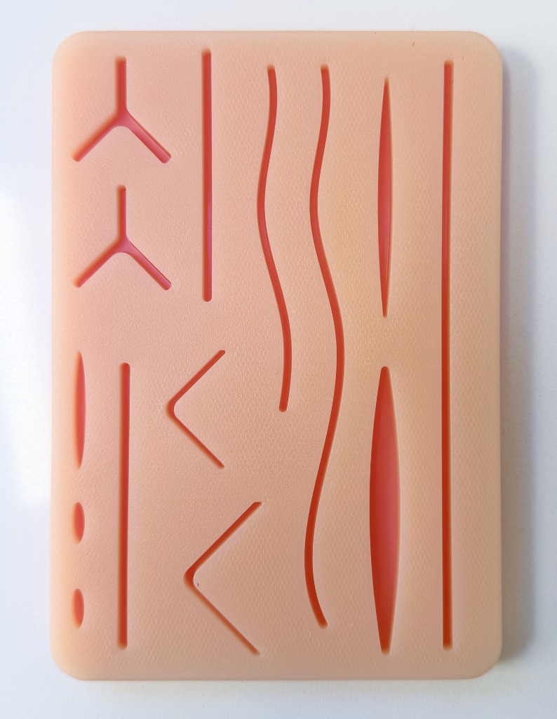 Skin, fat and muscle layers with pre-cut wounds and horizontal mesh reinforcement. Non-slip base keeps the pad stable on flat surfaces.